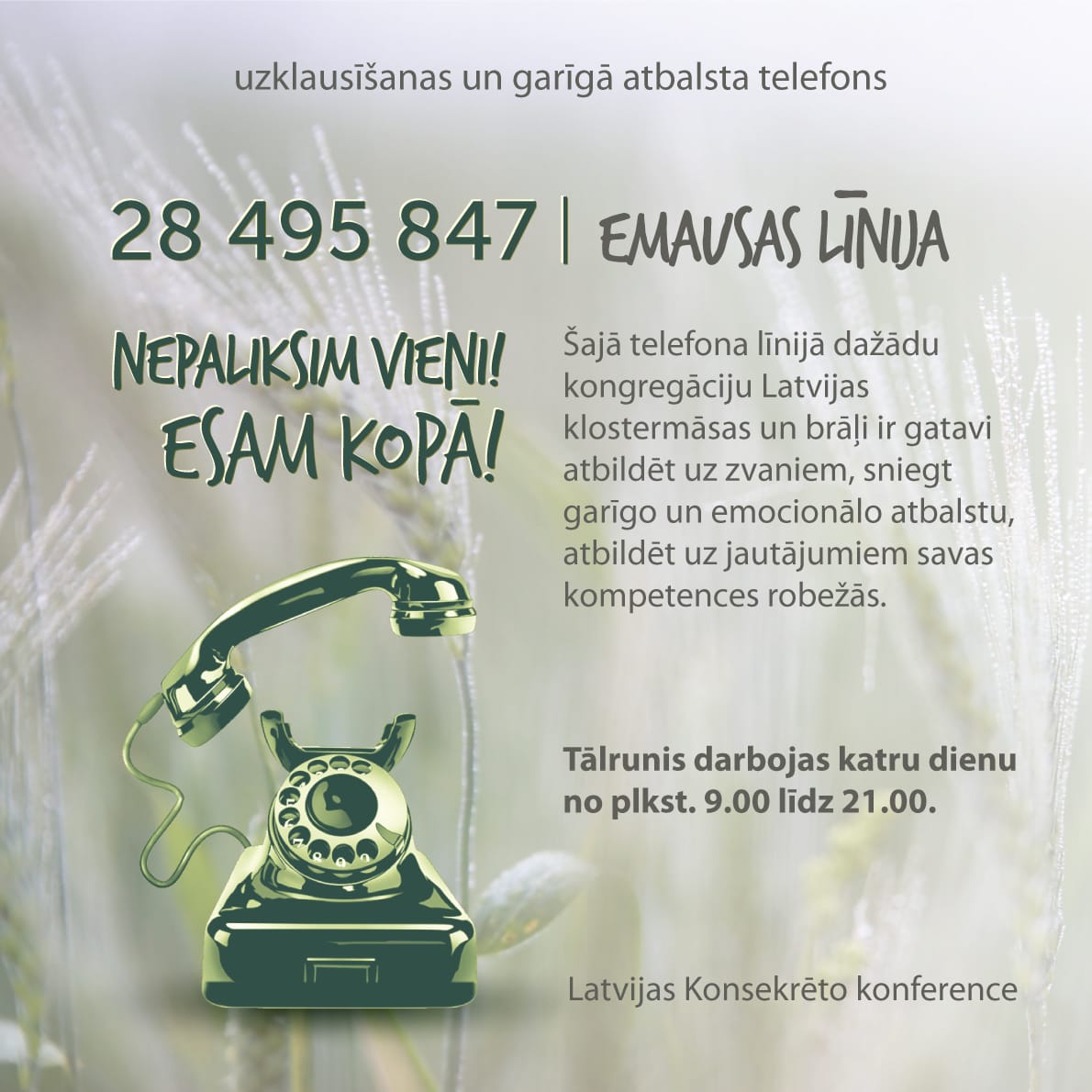 • Līnija darbosies katru darba dienu (pirmdien – piektdien) no plkst. 9 līdz plkst. 21 Latvijas klostermāsas un brāļi ir gatavi atbildēt uz zvaniem, uzklausīt, kopīgi lūgties, pieņemt lūgšanu nodomus, atbildēt uz jautājumiem. Iesakām šo numuru gan tiem cilvēkiem, kuri jūtas vientuļi un sarežģītās dzīves situācijās, gan arī jauniešiem un pieaugušajiem, kuri meklē atbildes uz savas dzīves svarīgiem jautājumiem. Dažreiz palīdzība un atbildes, un vienmēr lūgšanas atbalsts ir viena zvana attālumā. Emausas līnijas tālruņa numurs: 28495847 (zvani LMT tīklā).